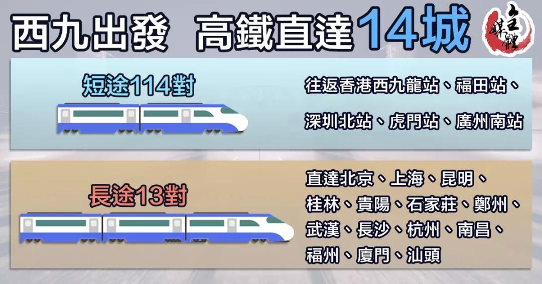 除高峰期往來廣州南、虎門、深圳北等站的日均114對短途列車外,運營初期西九龍總站日均將有13對長途列車,可直達北京、上海、武漢、成都、重慶、汕頭等內地城市。
