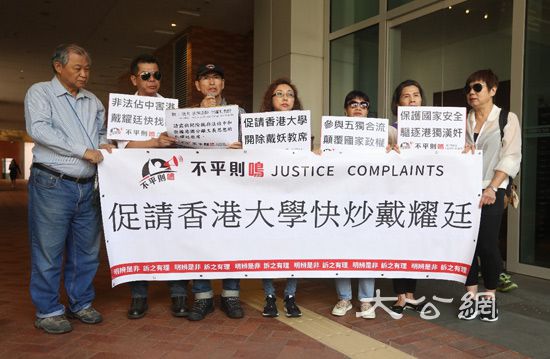 有七名「不平則嗚」成員,今早10時30分左右在港大法律系大樓外拉起橫額,他們稱代表全港市民,指戴耀廷「參與五獨合流,顛覆國家政權」,行為嚴重違反國家憲法及香港基本水法,認為戴耀廷行為已損害港大百年校譽,校方應懲處戴耀廷,開除教席,防止他已誤人子弟。