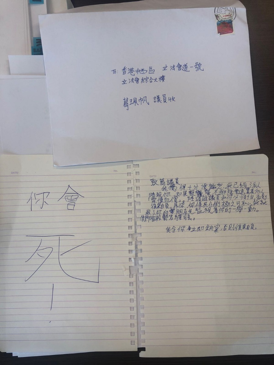 繼律政司司長鄭若驊、兩名選舉主任及多名立法會議員上星期收到用日文寫的恐嚇信後,葛珮帆的辦事處今日再收到由香港寄出的「死亡」恐嚇信。信中有人用大字寫上「你會死!」表明會派人暗殺葛珮帆,亦提及「會派人殺死葛珮帆的朋友,監視其的一舉一動」,甚至寫上「暗殺鄭若驊」等字句。寄信人又要求葛珮帆就上星期的恐嚇信報案銷案,否則「後果自負」。