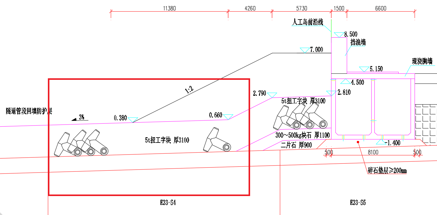 管理局指,報道中指防波堤扭工字塊被沖散的位置,是在基礎設計時為了保證基礎承載力均勻過渡,進行了沉管隧道頂部回填防護荷載的減載設計。該部位隧道頂部採取安裝減載沉箱+回填輕質材料+水下安裝扭工字塊潛堤的結構形式,扭工字塊的設計標高即在水面以下並按規範要求採取隨機擺放。