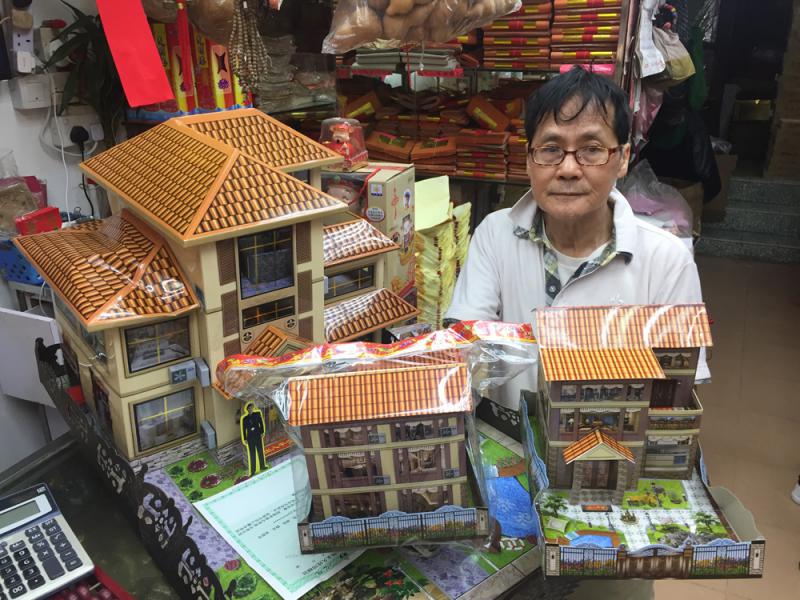 至於住方面,則有袖珍紙紮大宅應市,樓高三層的「納米獨立屋」,大廳、廚房、健身房和露台一應俱全,近期熱賣,日賣逾二十個。杜解釋,售價480元的傳統紙紮大宅體積龐大,長闊高逾一米,孝子賢孫往拜祭時「難拎上山」,鮮有客人選購。「納米獨立屋」體積細小,「帶着拜山話咁易」,且每間只售48元,價錢相宜,他笑言「現實中納米樓升值空間遠高於豪宅呢!」