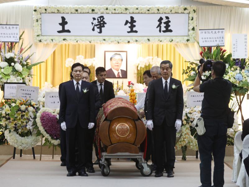 圖:全國政協副主席梁振英(前排右)、中聯辦原副主任林武(前排左)等一共八人為計佑銘扶靈