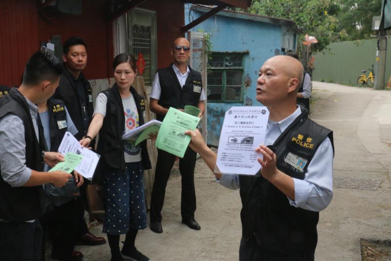 元朗南生圍一個月內接連發生三宗縱火案,元朗警區重案組已接手連串案件展開調查,但至今無人被捕。新界北總區防止罪案辦公室人員昨日到南生圍,派發滅罪宣傳單張,向村民講解防罪信息。警方到達元朗南生圍橫水渡碼頭,以及到村內挨家挨戶派發宣傳單張,沿途又在燈柱、欄杆等當眼處張貼宣傳單張,單張上寫有「縱火屬嚴重罪行」,另外,又向村民講解防罪信息,提醒村民留意可疑人士,防止罪案發生,呼籲他們如發現可疑人物,應致電通知警方跟進。 大公報記者周慶邦攝