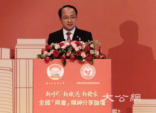 香港中聯辦主任王志民在「新時代、新機遇、新發展——全國『兩會』精神分享論壇」發表講話(大公文匯全媒體記者麥鈞傑攝