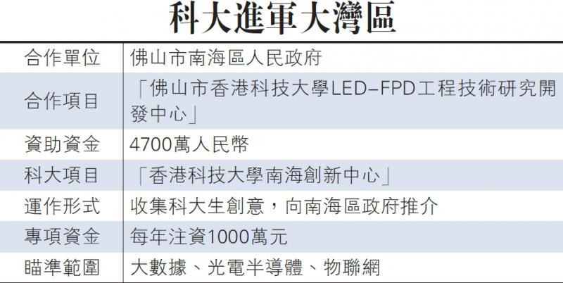 科大率先於今年建立「香港科技大學南海創新中心」,由科大派專員營運。科大機械及航空航天工程學教授李世瑋表示,創新中心為科大學生提供到內地發展的平台,主要收集港生具潛力的創科、創業理念,並將之推介到南海,「港生一過去就有200至300萬元資金,是香港無法給的支援」。