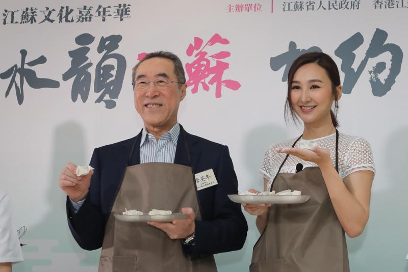 香港江蘇社團總會會長唐英年昨日在嘉年華發布會上大展廚藝,親手包薺菜糰子和菜肉雲吞,他自嘲在家裏「只會吃不會包」,形容包糰子就是「搓一搓,撳一撳」。他緊接包雲吞,他稱,港人熟悉上海雲吞,但不是太多人知道江蘇無錫亦出名雲吞,特點「鮮甜多汁」,希望港人在嘉年華享用到江蘇各式美食。