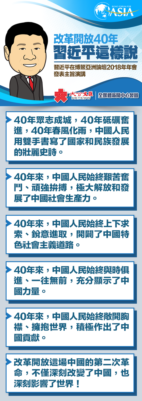 國家主席習近平應邀出席博鰲亞洲論壇2018年年會開幕式並發表重要主旨演講。習近平回顧了中國改革開放40周年歷程並指出,中國人民用雙手書寫了國家和民族發展的壯麗史詩。這是中國的第二次革命,不僅深刻改變了中國,也深刻影響了世界!