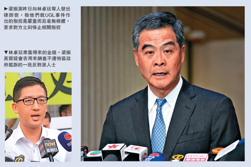 民主黨立法會議員林卓廷等人前日召開記者會,聲稱要發起「眾籌」行動,籌款200萬元,向梁振英追究UGL事件。全國政協副主席、前行政長官梁振英昨日向林卓廷等人發出律師信,指他們就UGL事件作出的指控是嚴重而且毫無根據,要求對方立刻停止相關指控,並會保留一切日後採取法律行動的權利。梁振英亦在社交網站質疑,林卓廷眾籌得來的金錢會否用來調查不遭特區政府起訴的一批反對派人士。/大公報記者 龔學鳴