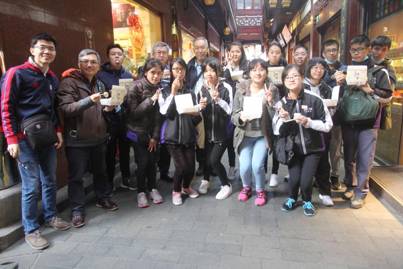 圖:張煊昌中學一班學生在上海城隍廟吃小籠包