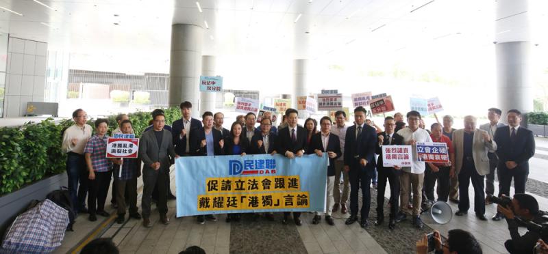 一眾民建聯成員手持「反港獨 護法治」、「擁護基本法 嚴懲戴耀廷」等標語,高呼口號,要求立法會跟進戴耀廷事件。民建聯社區幹事植潔鈴表示,戴耀廷不單策動違法「佔領中環」,撕裂社會及破壞香港和平穩定,現更公然鼓吹香港成立「獨立國家」,企圖分裂國家,令港人焦慮。她強調,任何「港獨」言行均違反國家憲法及基本法,「鼓吹『港獨』,不單破壞『一國兩制』,危害國家和香港的利益,更為香港社會帶來無比禍害」。