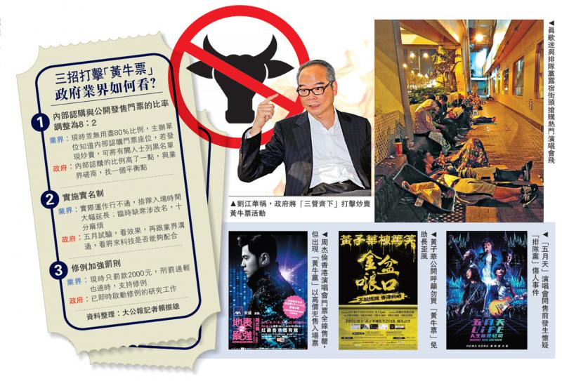 「黃牛票」情況猖獗,引起市民關注!特首林鄭月娥日前表示,考慮提高罰則把炒賣門票活動刑事化,民政事務局局長劉江華稱,研究降低公開發售門票內部認購可佔八成的比例,連同下月實施的實名制試行,「三管齊下」打擊炒賣黃牛票活動。有業界人士認為,演唱會出現炒賣黃牛票,根本原因是場地不足,本港鄰近地區例如廣州,已有四至五個大型場館,每個足夠容納一萬名觀眾,香港必須急起直追。/大公報記者 賴振雄