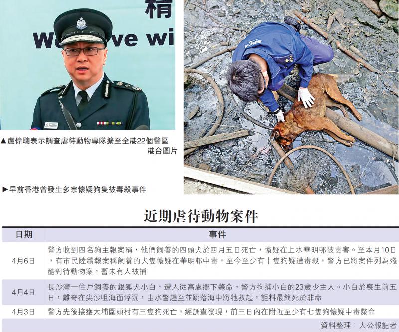 近日接連發生的虐待動物案件惹人關注,警務處處長盧偉聰昨日宣布,警方調查虐待動物的專隊由現行13個警區,擴至全部22個警區,各專隊人員均由區內刑事調查隊警員組成,透過平台交流調查虐待動物案件的情報資訊和經驗。盧偉聰強調,警方一向非常支持愛護動物,隊伍名稱雖不是「動物警察」,但並非不夠專業。關注動物的團體與立法會議員均表示,歡迎警隊的新安排。/大公報突發組