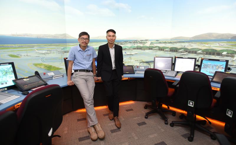 圖:鄧勤正(左)稱,每名見習空管員需在塔台模擬器受訓三個月
