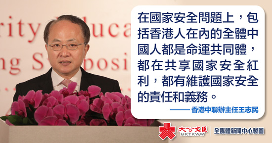 大公網訊 「全民國家安全教育日」今日(15日)上午首次在香港舉行。香港中聯辦主任王志民在研討會上講話時強調,在國家安全問題上,包括香港人在內的全體中國人都是命運共同體,都在共享國家安全紅利,都有維護國家安全的責任和義務。
