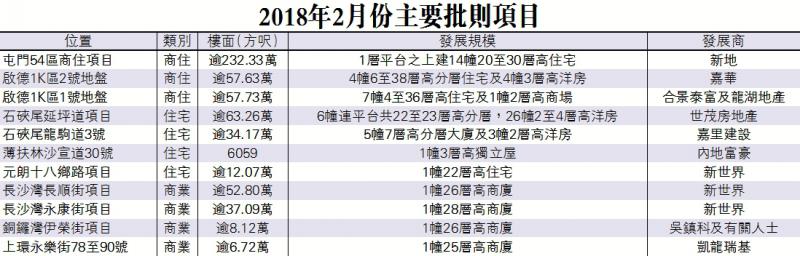 屋宇署於今年二月份共批出21份建築圖則,其中住宅及商住發展項目佔11份,商業發展項目佔六份。住宅項目中,以位於青山醫院西北方及寶田邨以東的新地項目最矚目,佔地超過46.13萬方呎,今次獲批首份建築圖則顯示,項目會在兩層地庫停車場及1層平台之上,興建14幢20至30層高住宅大廈,住宅樓面約227.14萬方呎,估計可提供約4500至5000伙中小型單位,商場樓面則只有約5.2萬方呎。
