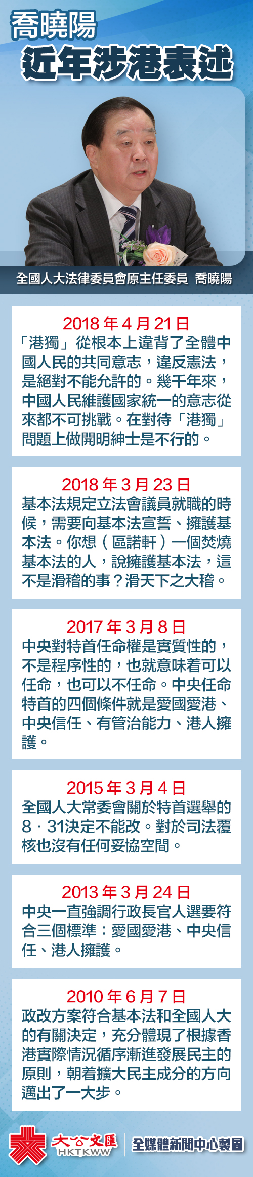 大公文匯全媒體報道:全國人大法律委員會原主任委員喬曉陽今日(21日)在香港出席國家憲法高端論壇暨紀念《基本法》頒布二十八周年研討會。針對近幾年香港出現宣揚「港獨」及激進勢力,喬曉陽強調,「港獨」永遠不能得逞。近年來喬曉陽在涉港問題上的表述,全媒體帶您一圖睇曬。