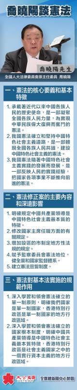 全國人大法律委員會原主任委員喬曉陽今日(21日)上午出席國家憲法高端論壇暨紀念《基本法》頒布二十八周年研討會,並向參加活動的香港各界人士宣講了憲法、憲法修正案以及憲法對基本法的規範作用等內容。喬曉陽講話有哪些要點,一圖帶你看。