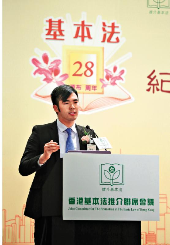 【大公報訊】記者湯淩琰報道:香港大專生發展協會主席何嘉浚(圓圖)昨日出席國家憲法高端論壇暨紀念基本法頒布28周年研討會時表示,本港對於基本法早期、中期的教育不應流於表面,後期教育不應與社會脫節。風采中學校長何漢權建議,教師可從香港的由來開始,逐步引導學生,幫助學生深入理解基本法。