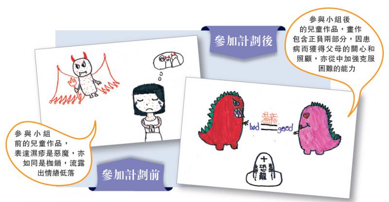 香港大學推算估計,全港有16萬名14歲以下兒童患濕疹。有病童透過繪畫表達,視濕疹如惡魔降臨,像枷鎖般隔絕自己與父母的關係,情緒與社交生活均受影響。參與的病童與家長分別接受18小時的課程,學習如何應對濕疹,自我提升抗逆力等。該名視濕疹如惡魔的孩子參加計劃後,繪畫內容較正面,理解患病不是只有負面,患病後,感受到父母關心和照顧。