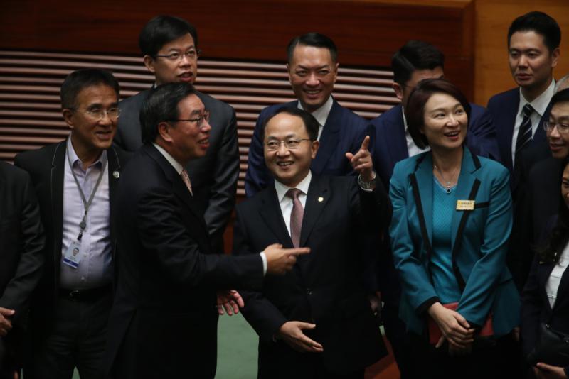 圖:中聯辦主任王志民昨出席立法會午宴後參觀議事廳,與議員們愉快交談 大公報記者何嘉駿攝