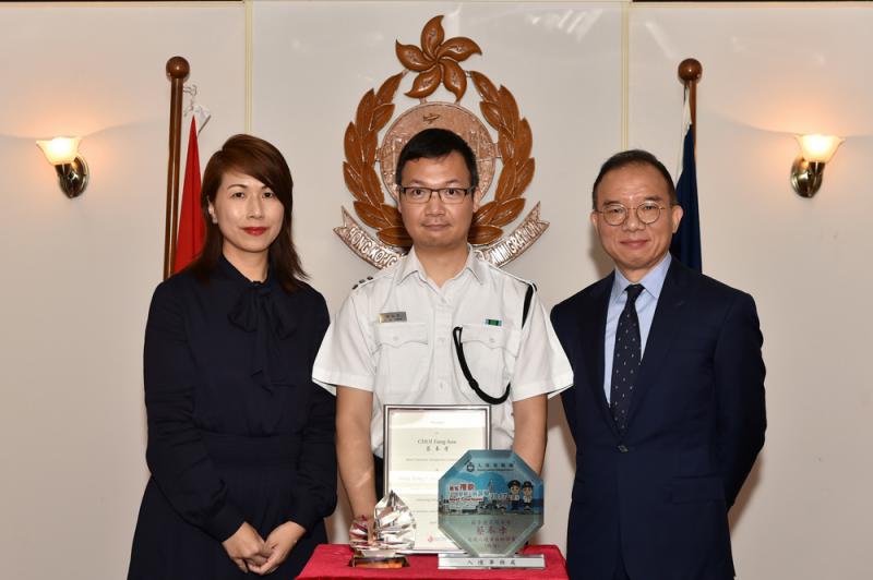 圖:梁美寶(左)和曾國衞(右)頒發獎狀和紀念品予「最有禮貌入境管制人員」蔡奉孝
