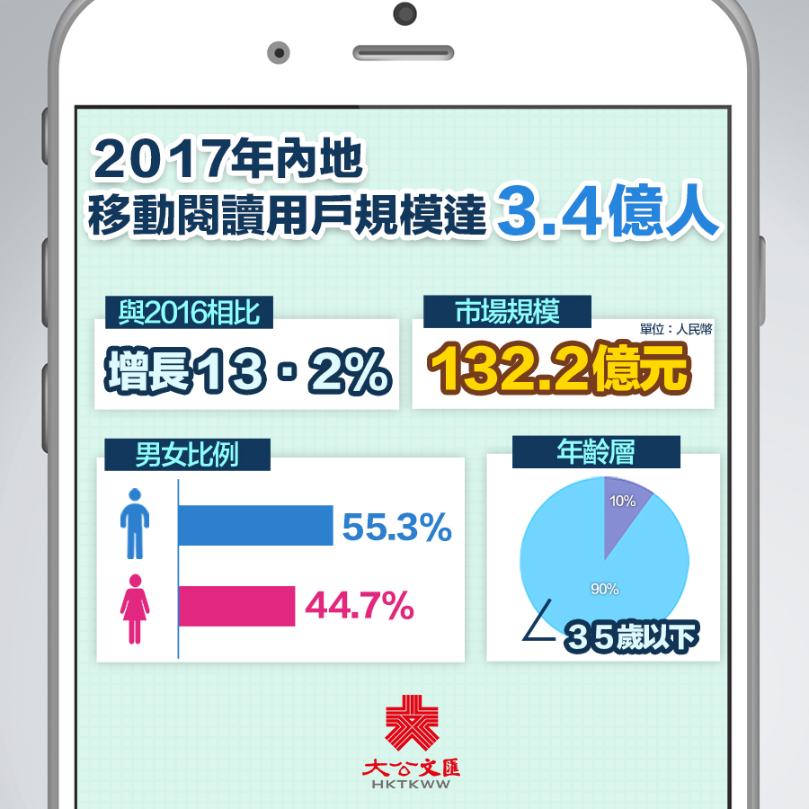 大公文匯全媒體報道:研究機構艾瑞諮詢日前發布報告顯示,2017年,中國內地移動閱讀用戶規模達到3.4億人,同比增長13.2%;市場規模達132.2億元人民幣,同比增長32.1%。用戶結構方面,男性佔比達55.3%;35歲以下用戶佔比近九成。