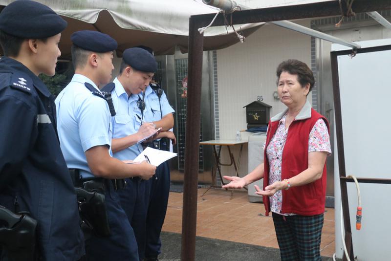 圖:機動部隊警員在山貝村向村民進行問卷調查 大公報記者黃俊華攝