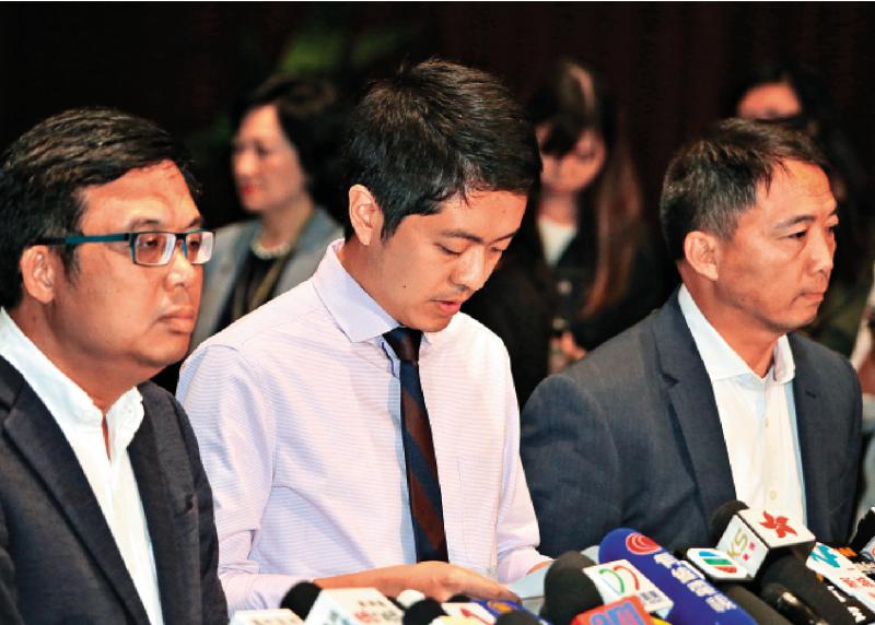 圖:許智峯在民主黨議員胡志偉和塗謹申陪同下在立法會大樓內見記者交代事件,並認衰「道歉」 大公報記者麥潤田攝