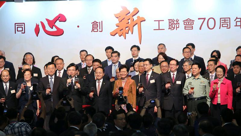 工聯會70周年會慶晚會冠蓋雲集,逾1000名來自政商界、社團友好及工會代表出席共慶,氣氛熱烈。中聯辦主任王志民致辭時讚揚,七十年來,工聯會始終高舉愛國愛港旗幟,堅持愛國、團結、福利、參與政治方針,始終不忘為打工仔爭權益,謀福利的初心,不管在過去頑抗港英政權,支援新中國建設,到實現香港順利回歸,平穩過渡等等各界歷史時期都發揮了重要的作用。