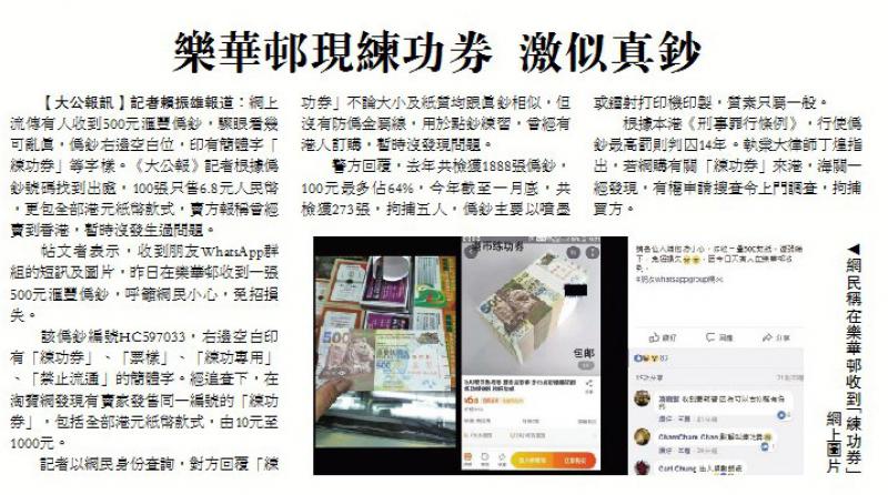 警方當時回覆大公報記者查詢時稱,去年共檢獲1888張偽鈔,100元最多佔64%,今年截至一月底,共檢獲273張,拘捕五人。執業大律師丁煌並指出,若網購有關「練功券」來港,海關一經發現,有權申請搜查令上門調查,拘捕買家。