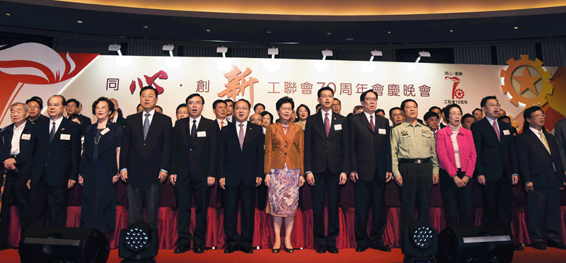 大公網訊 4月26日晚,香港工會聯合會「同心·創新」成立70周年會慶晚會在九龍灣國際展貿中心舉行。中聯辦主任王志民、香港特區行政長官林鄭月娥,中華全國總工會黨組書記李玉賦應邀出席並致辭。外交部駐港特別派公署特派員謝鋒,特區政府政務司司長張建宗,中聯辦副主任何靖,解放軍駐港部隊副司令鄭國躍等共同主禮。內地有關省市總工會領導,香港各政團社團、商會和工會代表共1000餘人出席晚會。