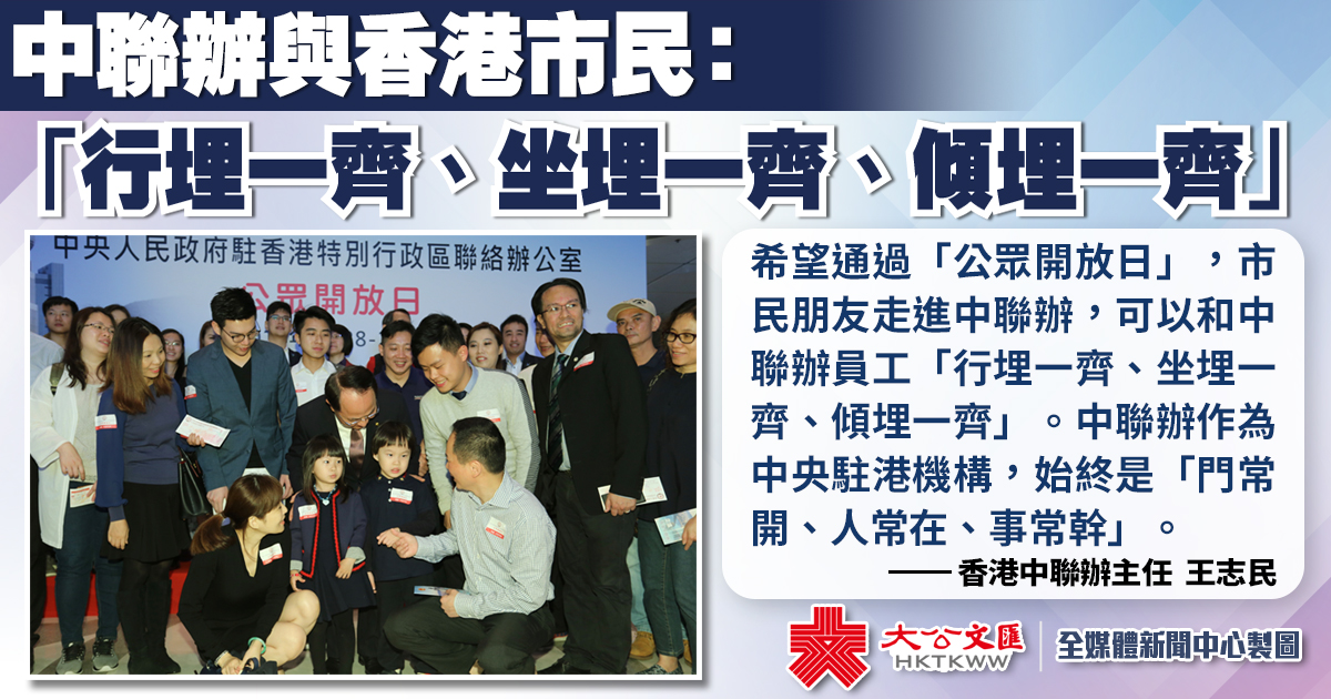 大公文匯全媒體報道:香港中聯辦今日(28日)首次舉辦「公眾開放日」,中聯辦主任王志民在開幕儀式致辭時表示,希望通過「公眾開放日」,市民朋友走進中聯辦,可以和中聯辦員工「行埋一齊、坐埋一齊、傾埋一齊」。中聯辦作為中央駐港機構,始終是「門常開、人常在、事常幹」。中聯辦過去、現在和將來,都與香港發展同心同行。