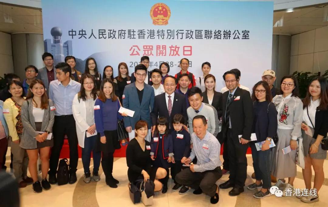 中聯辦昨日(28日)舉辦成立71年來首個「公眾開放日」活動,首批香港市民走進中聯辦大樓。圖為中聯辦主任王志民與參觀市民合影留念(中新社)