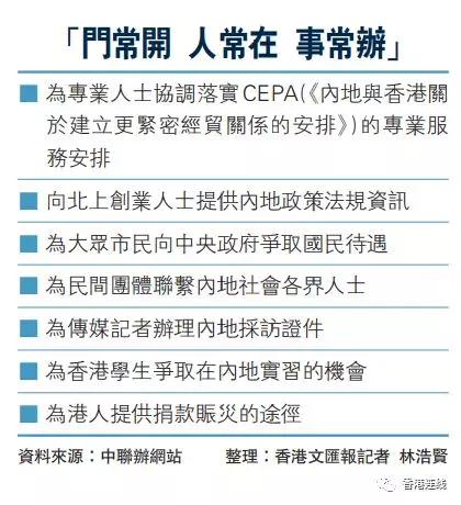 他說,過去受種種條件的限制,不少市民對中聯辦人的日常履職和工作環境了解不多,覺得中聯辦「有點神秘」,「其實,作為中央駐港機構,無論是過去在跑馬地的新華社香港分社,還是現在在西環的中央政府駐港聯絡辦,我們一直是門常開、人常在、事常辦,並不神秘。」