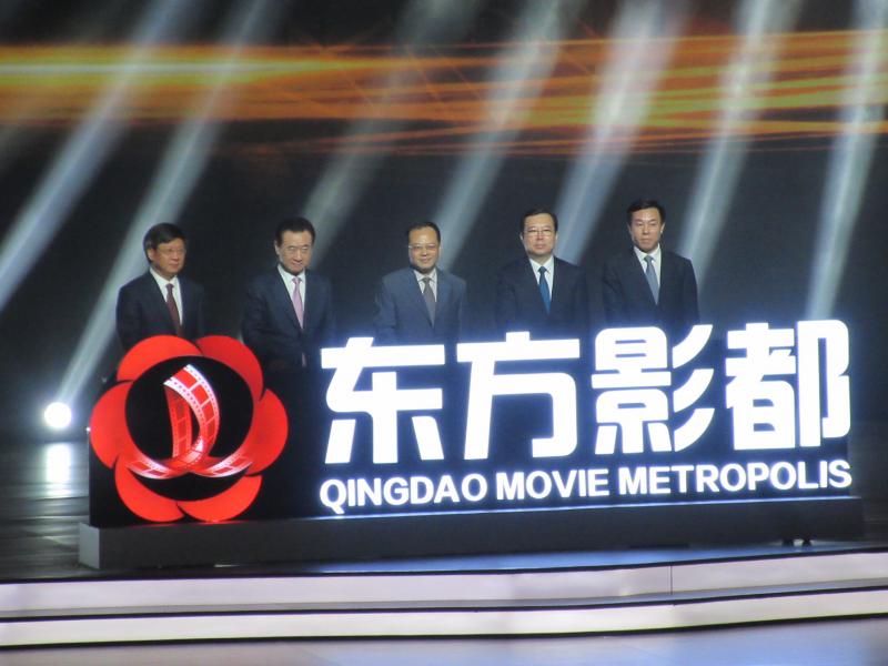 (左起)融創中國主席孫宏斌、萬達集團主席王建林、山東省副省長于傑、青島市長孟凡利、國家電影副局長李國奇出席青島東方影都開幕儀式。(大公報記者李潔儀攝)
