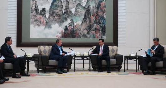 中央政治局委員、廣東省委書記李希(右二)與經民聯監事會主席林建岳(左二)交流粵港合作意見,左一為經民聯榮譽主席梁君彥,右一為廣東省委副書記、省長馬興瑞。
