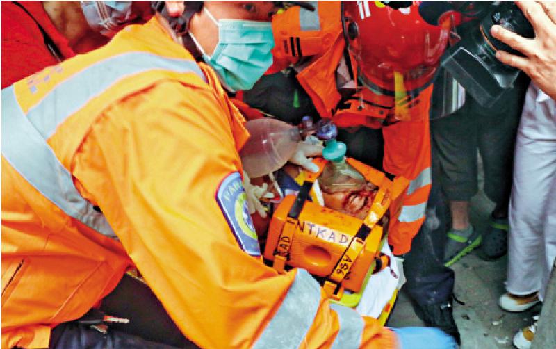 圖:消防專隊游繩救出工人,工人送院搶救後不治