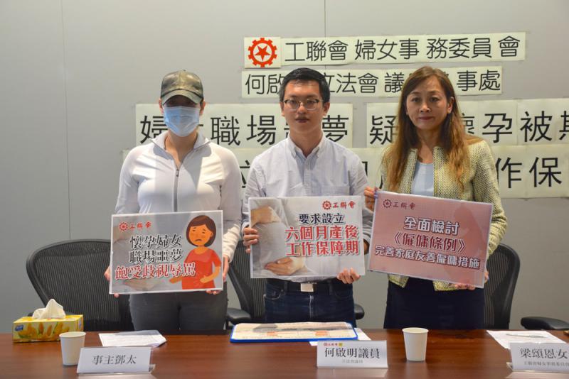 ▲工聯會要求設立六個月產後工作保障期。左起為鄧太、何啟明及梁頌恩