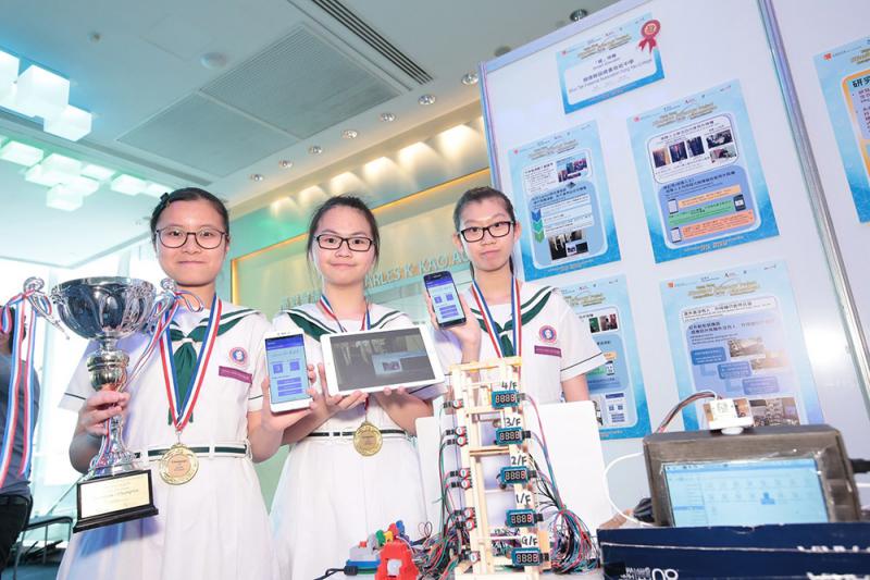 圖:劉芷欣(左)、陳可恩(中)、曾柔(右)設計智能「醒」降機,獲得本港多項資訊科技類大獎