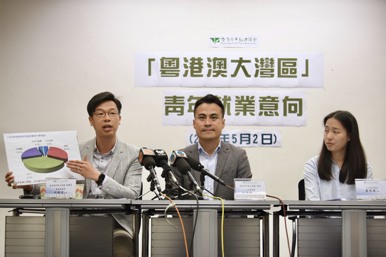 5月2日,香港青年動力協會會長郭偉強(中)發表粵港澳大灣區青年就業意向調查。香港中通社圖片