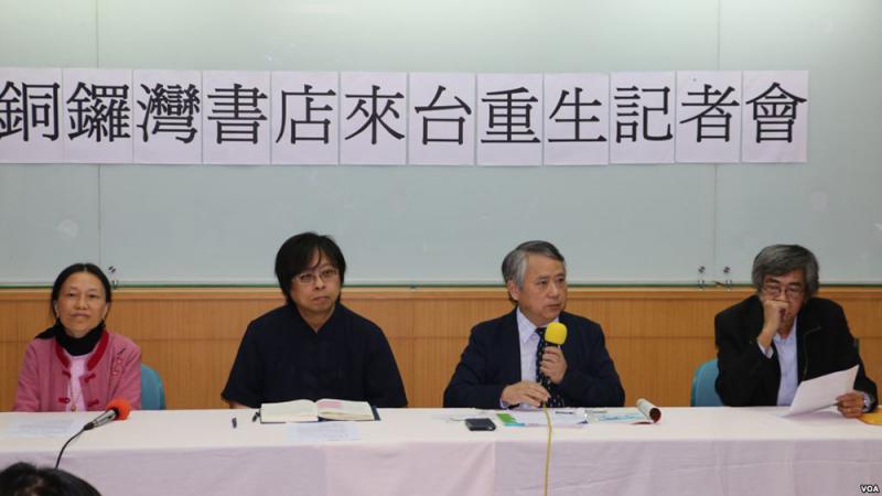 圖:上月十五日林榮基(右一)聯同台獨學者(左起)徐沛、曾建元、李酉潭於台北召開記者會,宣布銅鑼灣書店開幕細節