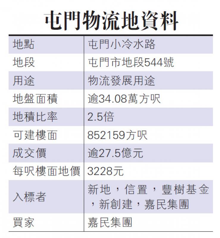 發展物流用地屬長線投資的地產項目,有別於現時樓價極高的商業或住宅項目,故標書數目不多,兼屬有營運經驗的發展商。該幅屯門物流用地,上周五截標時,包括新地(00016)、信置(00083)及新加坡豐樹基金等共五家發展商入標。地政總署昨日公布,地皮由最高標價的嘉民集團旗下Westlink Investments奪得,成交價為逾27.5億元,每呎樓面地價約3228元。
