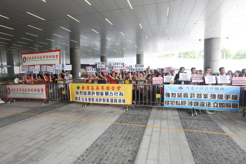 【大公報訊】記者龔學鳴報道:多個團體昨日先後到立法會示威區請願,高舉標語,高喊「許智峯知法犯法!」等口號,要求立法會嚴厲譴責並處理民主黨議員許智峯強搶女行政主任手機的暴力行為。
