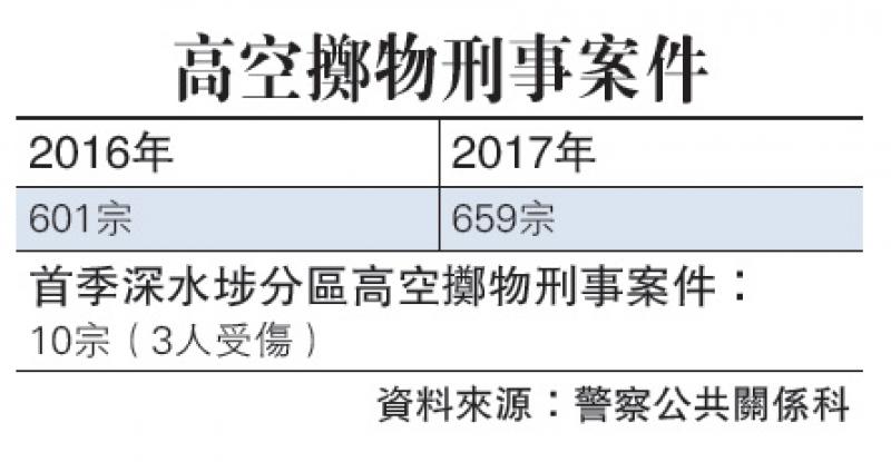 據香港法例第228章《簡易程序治罪條例》第4B條,如有人自建築物掉下任何東西,或容許任何東西自建築物墜下,以致對在公眾地方之內或附近的人造成危險或損傷者,掉下該東西的人,即屬犯罪,可處罰款一萬元及監禁六個月。如高空擲物引致其他人死亡,則可能被控謀殺或誤殺罪,可處終身監禁。