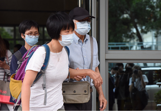 香港一名77歲前男教練,涉嫌在8年前非禮其學生,案件今日於粉嶺裁判法院提堂。圖為被告(右)離開法院。(香港中通社)
