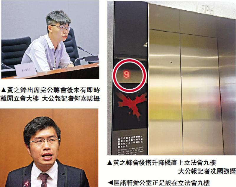 記者昨日在立法會《國歌法》公聽會後發現,出席公聽會的眾志秘書長黃之鋒,離場後未有離開立法會大樓,而是搭升降機直奔九樓。目前反對派議員的立法會辦事處大多設在九樓和十樓,區諾軒當選後,入駐的恰恰是眾志主席羅冠聰被DQ前在九樓的辦事處。