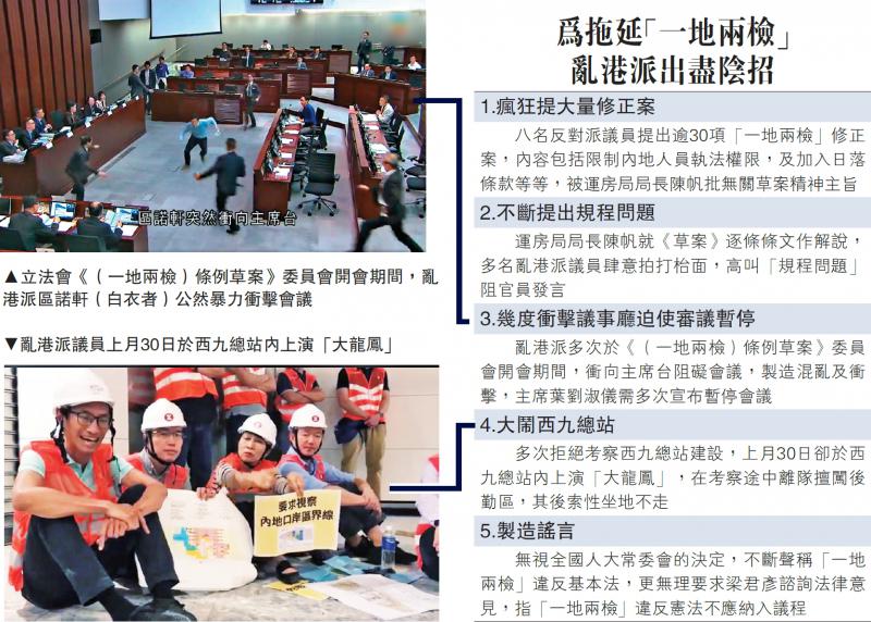 「一地兩檢」安排「三步走」進入「第三步」本地立法階段,亂港派正使出各種陰招「拉布」,包括提出大量修正案、不斷提出規程問題阻官員發言,甚至「賴地做騷」大鬧西九總站等(詳見表)。