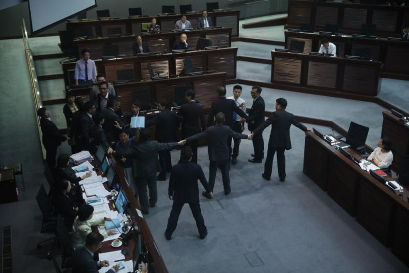 圖:搞事議員欲衝向主席台,被保安員阻止\大公報記者蔡文豪攝