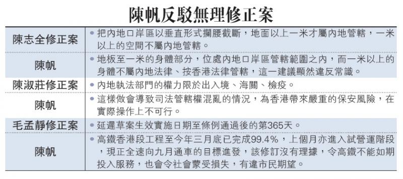 反對派這次就「一地兩檢」合共提出了幾十項修正案。陳帆表示,這些修訂偏離了草案的主旨與範圍,既不符合草案精神,也不具可行性,政府已在會上清楚表明反對,並解釋理據。