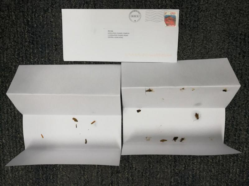 【大公報訊】記者龔學鳴報道:自三月及四月兩度接獲死亡恐嚇信後,民建聯葛珮帆的立法會議員辦事處昨日再收到由香港寄出的恐嚇信,信上黏有多隻被壓扁的蟑螂(曱甴)屍體,狀況極為噁心。葛珮帆強烈譴責發信者,斥有關行為極其幼稚及無聊,並涉嫌觸犯刑事罪行,強調已就事件報警。